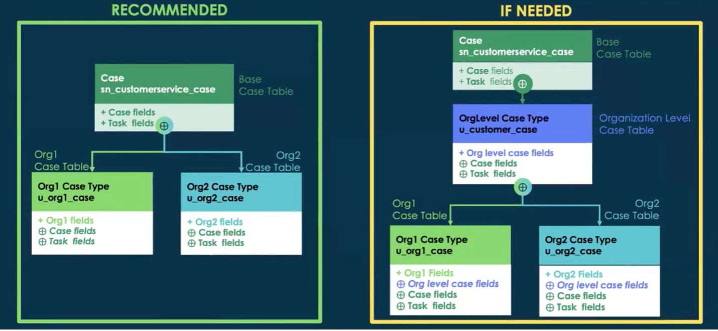 If you need multiple case types, it is recommended to inherit from the base case table and create your unique case type fields directly within the new case type table. If you have a substantial amount of common case fields that need to be inherited, then create an organization-level case table that extends the base case table. This allows the substantial number of common fields to be inherited by all case types, while still allowing for unique creation of fields within each specific table.