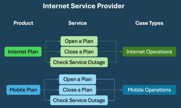 A case is the unit of work performed by agents to resolve a customer issue. Work can vary in many ways, including difficulty, duration, and type. Work also changes depending on the industry, enterprise, department, customer type, and channel. A new case type can be beneficial for an industry that offers multiple products, such as an internet service provider (ISP). An ISP offers different products such as internet plans and mobile plans, which can be represented by having their own case types. Within each product offered, there can be multiple services such as a personal plan, business plan, canceling a plan, and service outages.