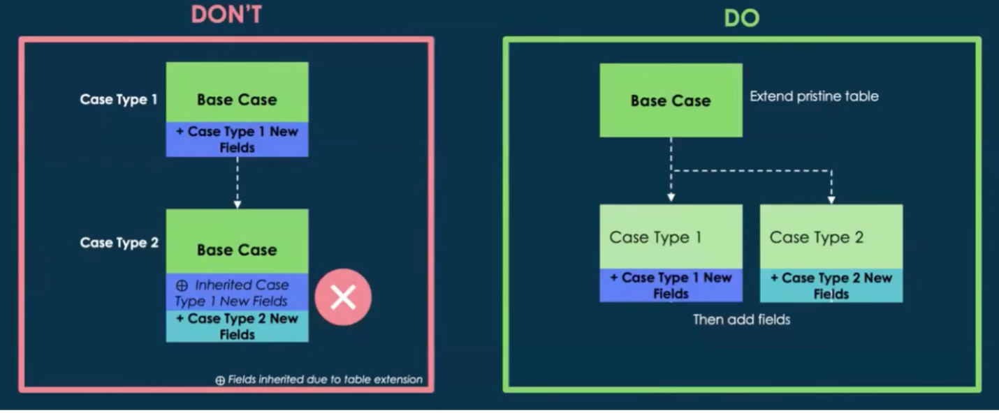Keep the baseline case table pristine to support future case types, rather than adding new case type fields directly to the baseline case table. If fields are added directly, they can be inherited to child tables.